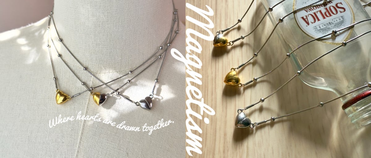 惹かれ合う心を、かたちに。 磁力で寄り添うハートモチーフが印象的な、 シンプルなボールスネークチェーンネックレス、 Magnetism(マグネティズム)。 マグネット仕様で着脱もスムーズに。 ハート部分を前にしてチャームネックレスとしても、 後ろにしてシンプルなチェーンとしてもお使いいただけます。 重ね付けのアクセントとしても映える、 日常使いにもぴったりなミニマルな一本です。 ● Gold | Sincere - 真心 ● Silver | Calm - 無垢 ● Mix | Shifted - 心変わり 長さ:金具含め 約41cm