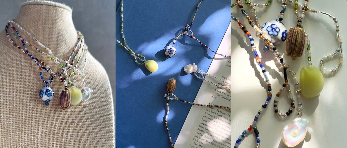 とけあって、輪になる。 留め具のない、オールビーズのシームレスなデザイン。 トップには、ヴィンテージパーツやボタン。 ビーズの合間には、天然石やパールをさりげなく。 輪のまま首元になじむ、 軽やかで自由なアクセサリー。 金属アレルギーの方にもおすすめのアイテムです。 ◯ Amber Stitch ドネーションビーズの刺繍のあたたかさと、 淡い天然石のニュアンスを大切に ◯ Indigo インポートセラミックビーズをメインに、 ソーダライトやラピスラズリの深い青、 遊び心ある色合いのガラスビーズをチョイス ◯ Glacier 大粒のバロックパールは存在感を、 小粒淡水パールや天然石、ガラスでまとめて透明感を ◯ Verdant ヴィンテージのイタリア製ボタンをトップに、 箱庭のようなグリーンの調和を意識して インポートパーツをメインにデザイン 長さ:約38㎝