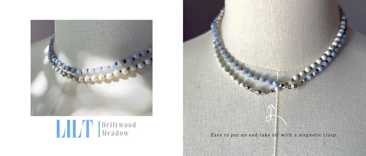 ガラスと石たち、陽の光を受けてきらめく瞬間を。 Lilt(リルト)シリーズは、 穏やかな色彩と透明感を大切に仕立てた、 小粒の天然石とガラスビーズのネックレス。 ひと粒ごとに異なる表情をもつ石の間で 静かな旋律を描くように首もとを彩るデザインです。 ● Driftwood|流木 グレーブルーのペルシャ湾カルセドニーに、 ブラウンガラスを組み合わせて、 海辺に流れ着いた流木をイメージしました。 — ペルシャ湾カルセドニー, ガラスビーズ ● Meadow|草原 ホワイトハウライトに濃いグリーンガラスを重ね、 草原を渡る風のような、澄んだ色合いに仕立てました。 — ホワイトハウライト, ガラスビーズ 長さ:金具含め 約41cm 留め具:マグネット式