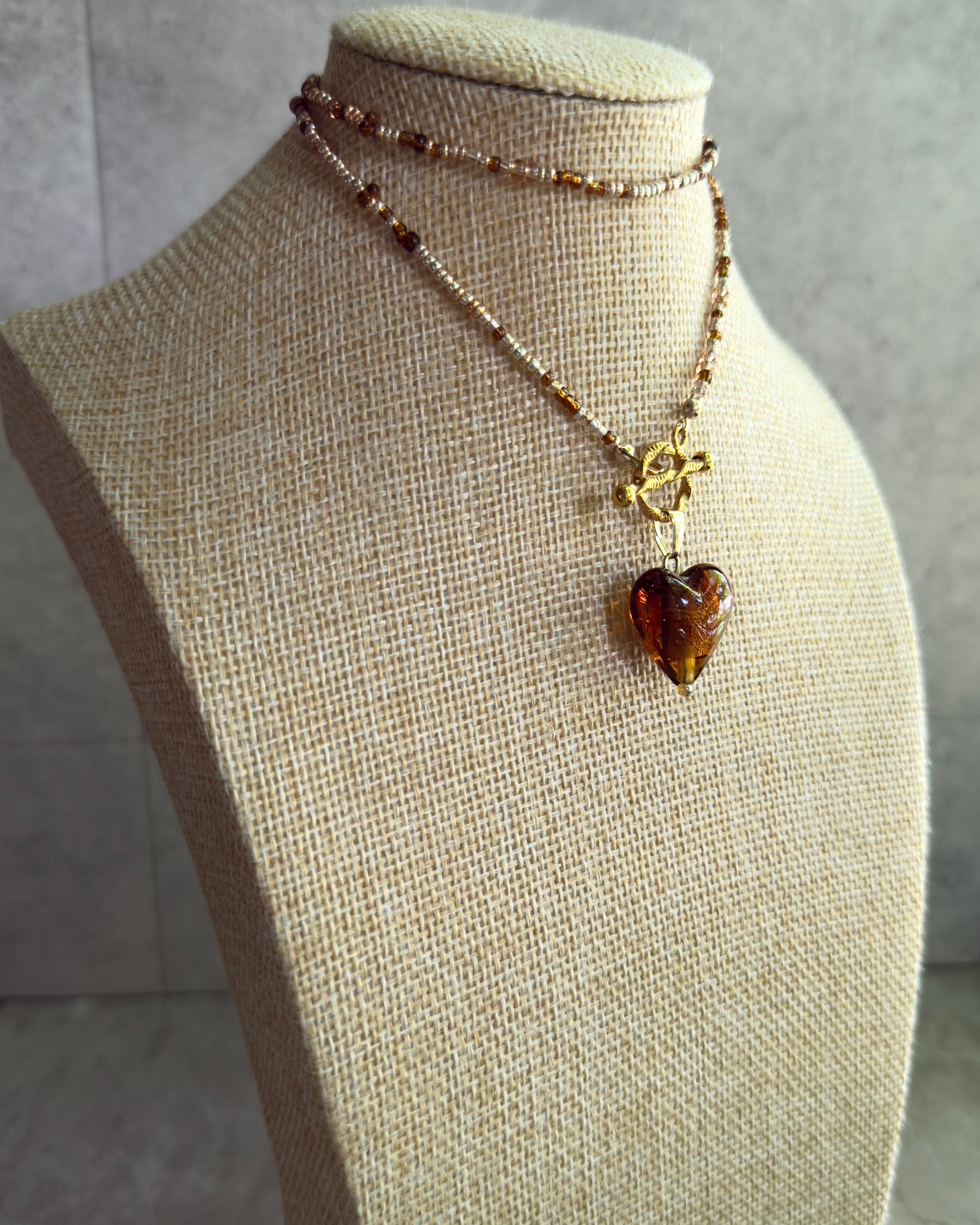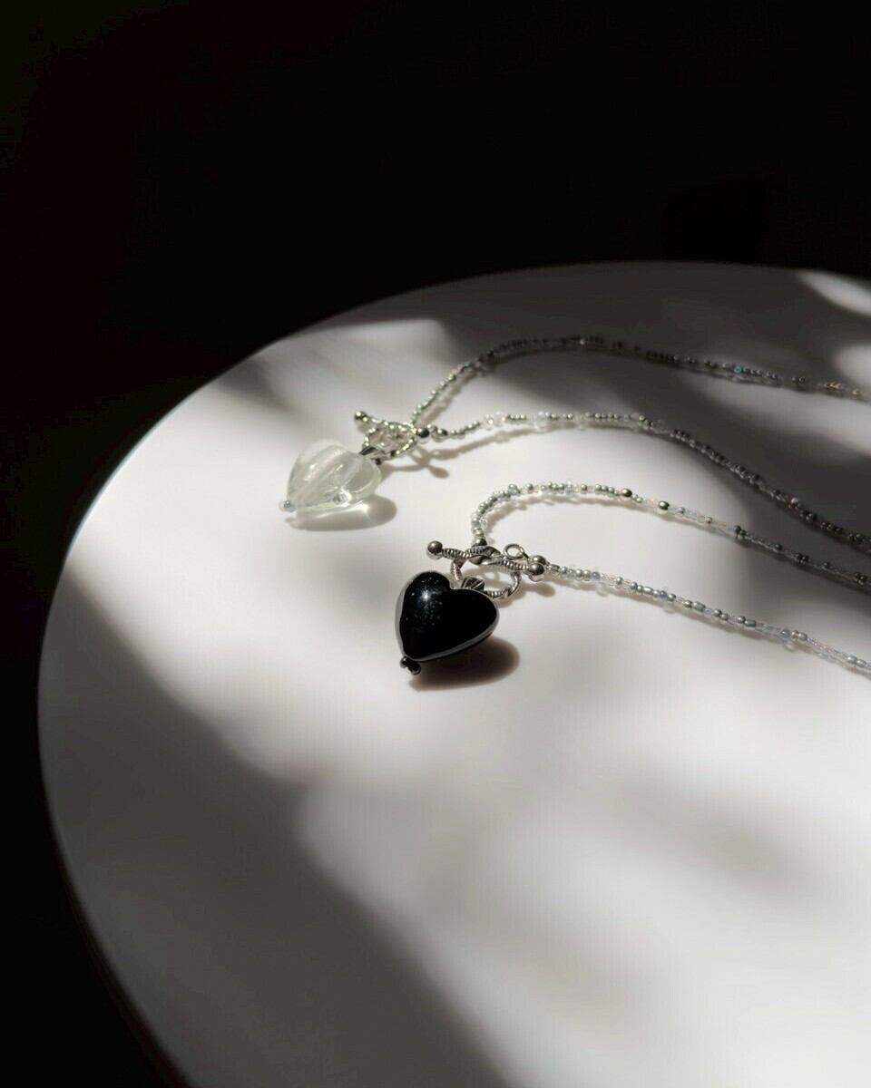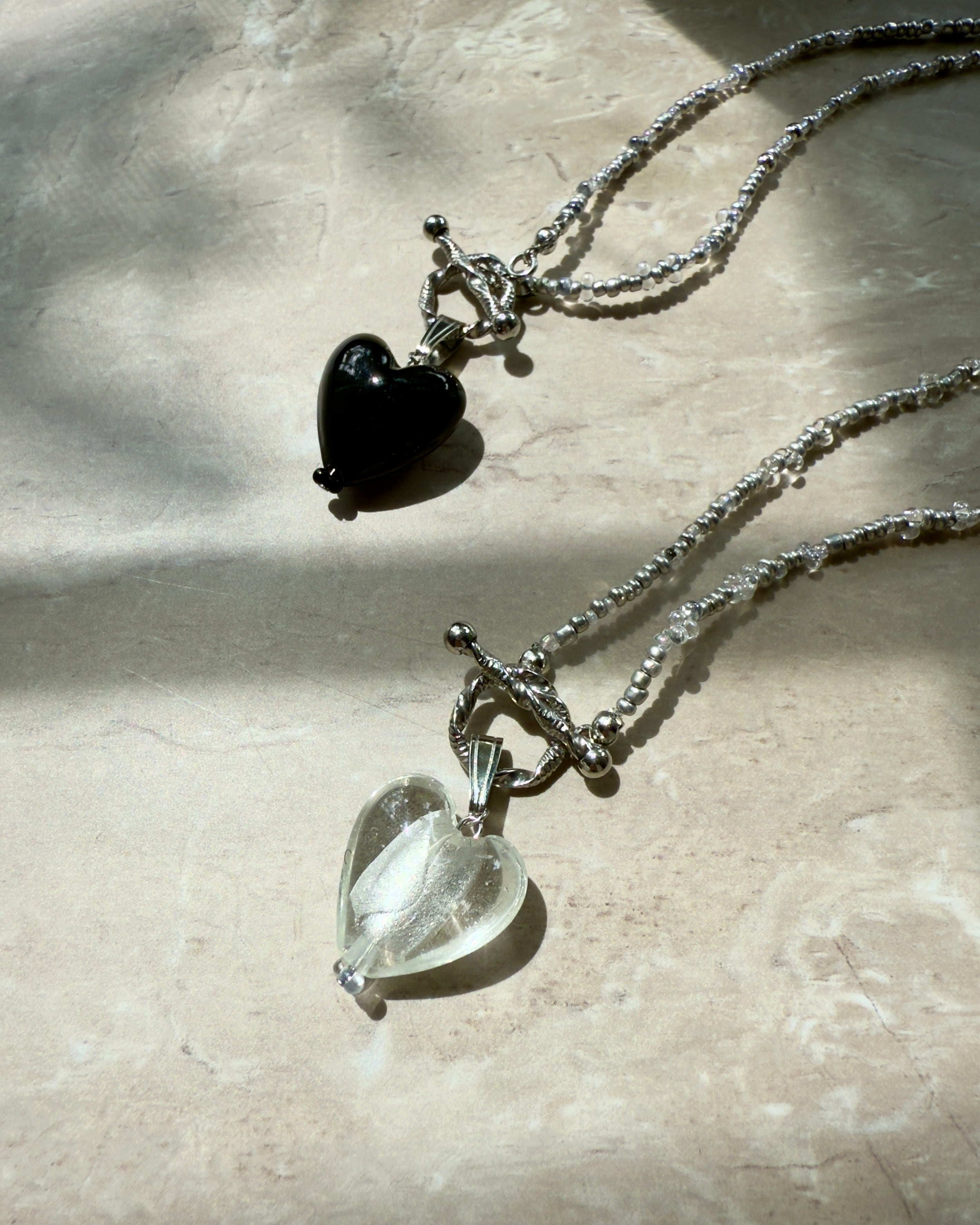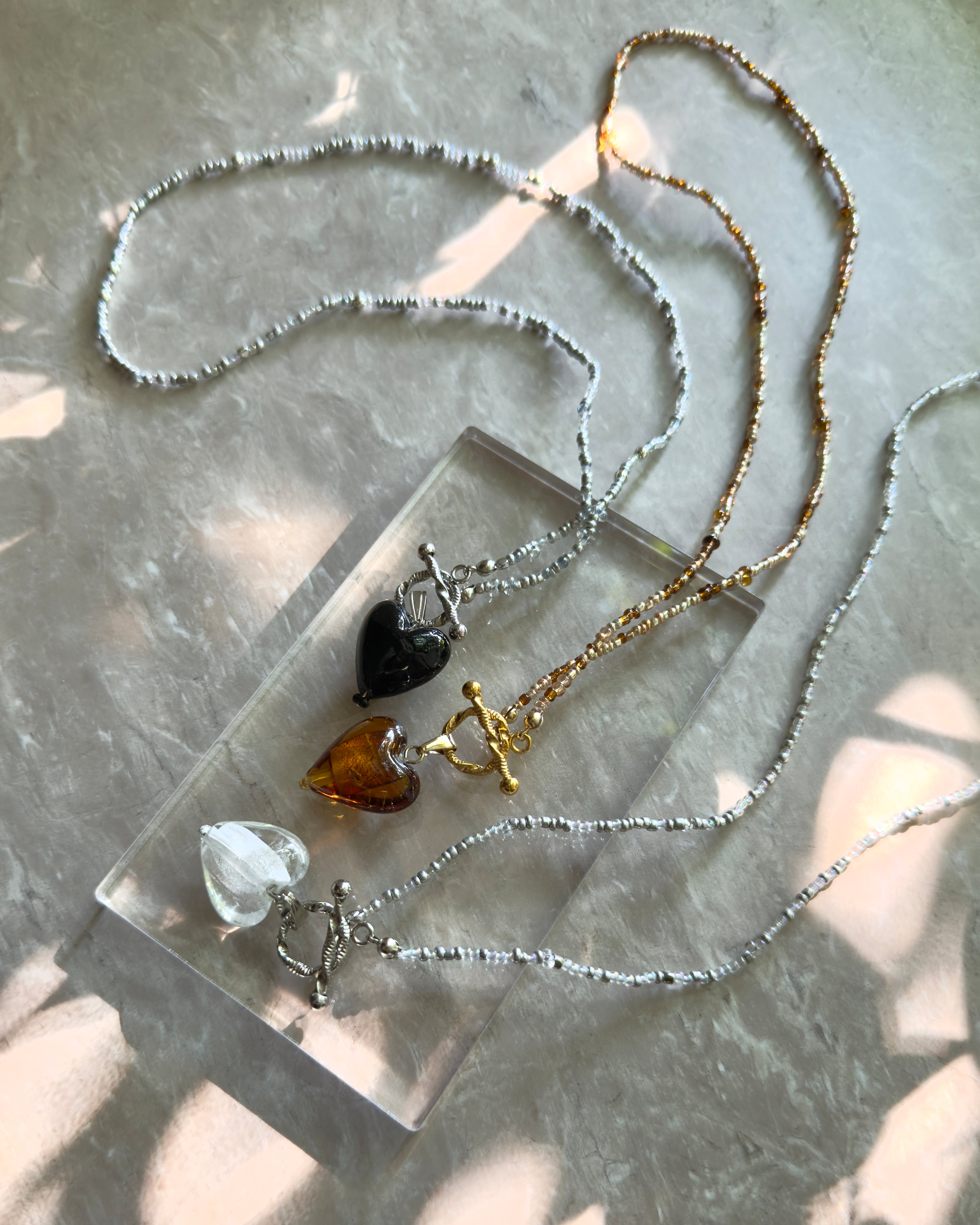 ガラスのハートが、自然の光と時間の移ろいを映し出すロングネックレス。